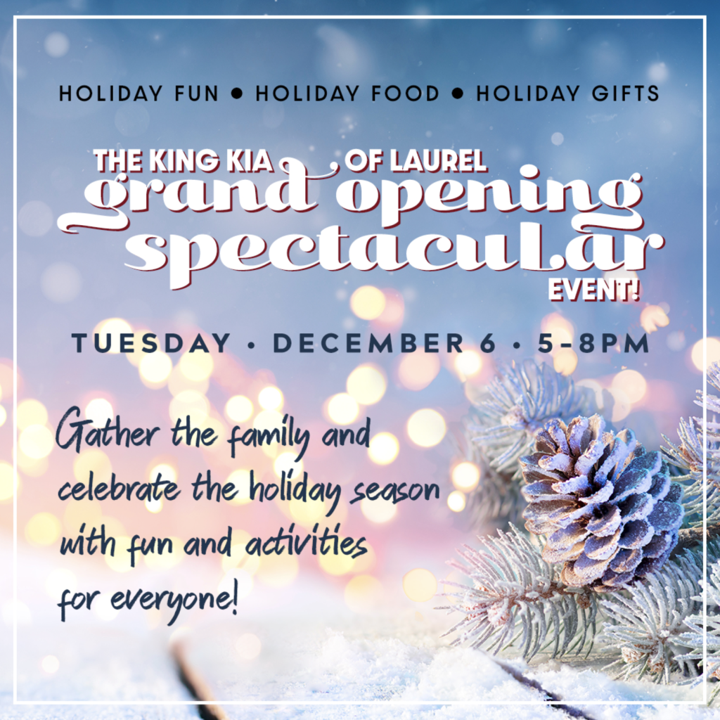 Tis’ the season to gather up all your family and friends and celebrate the close of another amazing year!! And, if you don’t have any fun holiday plans, don’t worry because King Kia of Laurel is throwing a Grand Opening Spectacular Event for our employees, customers, and community! Join our team for holiday fun, food, and plenty of awesome gifts! Taking place Tuesday, December 6th from 5:00 to 8:00 PM, stop by the King Kia of Laurel dealership at 14921 Baltimore Ave, Laurel, MD 20707 to party with some pretty great people and share the holiday spirit! Sign up to join in using our convenient online event sign in page tell us your name, email, phone number, and how many people will be in your party! We look forward to seeing you soon!