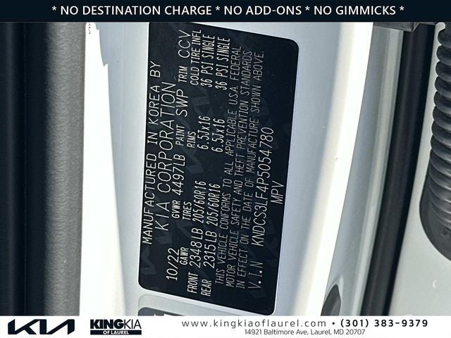 Dealer Disclosures and Disclaimer: Pricing throughout the website does not include taxes, tags, title, and $800 processing charge (not required by law), or dealer installed options (if applicable). All Inventory listed is subject to prior sale. While we diligently try to present information that is complete and accurate. the possibility exists for data error and information listed on this site may be incorrect, including omissions or typographical errors and is not guaranteed. The list of standard equipment and accessories contained on this website reflects the equipment which was standard at the time vehicle was manufactured. This vehicle may or may not contain some or most of the equipment and accessories listed as a result of the vehicle identification number equipment compilation provided by a third-party source. VIN equipment compilation is provided as a service by the dealer and a third-party source and is in no way intended to serve as a warranty or list of actual equipment contained on the vehicle. The vehicle photo displayed may be an example only. Internet pricing may not be combined with other offers. New vehicle discounts include all current manufacturer rebates and factory incentives. Some may require you to finance through the manufacturer lending institution and not all customers will qualify. Rebates may include but are not limited to Military Incentive; College Grad Rebates Consumer Cash Manufacturer Bonus Cash Lease Loyalty or Lease Conquest Cash and/or Regional Bonus Cash Incentives. Please contact King Kia of Laurel to verify price, options, incentive, availability, equipment and other vehicle details before any purchase May not represent actual vehicle. (Options, colors, trim and body style may vary) May not represent actual vehicle. (Options, colors, trim and body style may vary) May not represent actual vehicle. (Options, colors, trim and body style may vary)