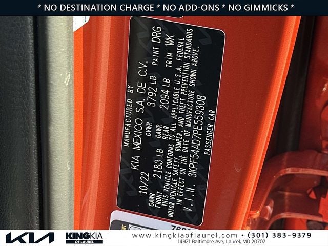 Dealer Disclosures and Disclaimer: Pricing throughout the website does not include taxes, tags, title, and $800 processing charge (not required by law), or dealer installed options (if applicable). All Inventory listed is subject to prior sale. While we diligently try to present information that is complete and accurate. the possibility exists for data error and information listed on this site may be incorrect, including omissions or typographical errors and is not guaranteed. The list of standard equipment and accessories contained on this website reflects the equipment which was standard at the time vehicle was manufactured. This vehicle may or may not contain some or most of the equipment and accessories listed as a result of the vehicle identification number equipment compilation provided by a third-party source. VIN equipment compilation is provided as a service by the dealer and a third-party source and is in no way intended to serve as a warranty or list of actual equipment contained on the vehicle. The vehicle photo displayed may be an example only. Internet pricing may not be combined with other offers. New vehicle discounts include all current manufacturer rebates and factory incentives. Some may require you to finance through the manufacturer lending institution and not all customers will qualify. Rebates may include but are not limited to Military Incentive; College Grad Rebates Consumer Cash Manufacturer Bonus Cash Lease Loyalty or Lease Conquest Cash and/or Regional Bonus Cash Incentives. Please contact King Kia of Laurel to verify price, options, incentive, availability, equipment and other vehicle details before any purchase May not represent actual vehicle. (Options, colors, trim and body style may vary) May not represent actual vehicle. (Options, colors, trim and body style may vary) May not represent actual vehicle. (Options, colors, trim and body style may vary)